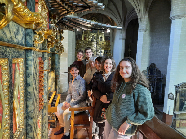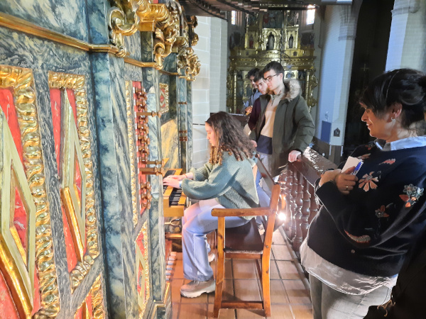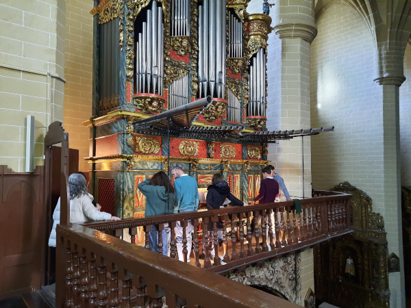 El pasado 19 de abril nuestra aula de órgano visitó el órgano de la iglesia de los P. Dominicos. Se trata de un instrumento construido en 1991 por el taller José María Arribalaga, y alojado en una bella caja barroca. Se trata de un órgano de gran calidad constructiva, y gran riqueza tímbrica, concebido según la tradición de la organería hispánica: teclados partidos en el do sostenido central, registros en batalla, arca de ecos, etc. Todo ello sin olvidar la nutrida muestra de registros ornamentales: pájaros, cascabeles, trueno, tambor, bordón de gaita, etc.